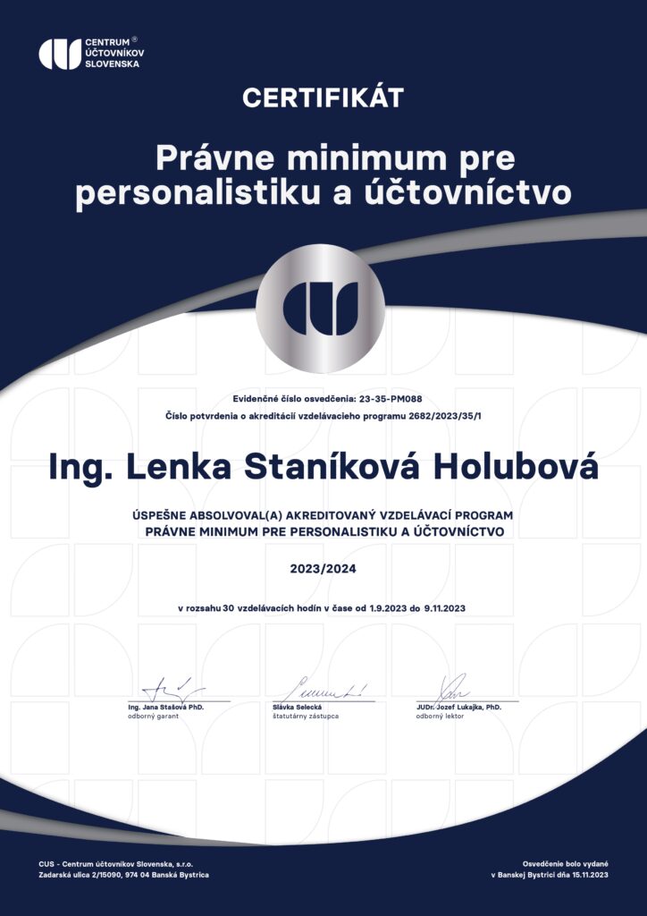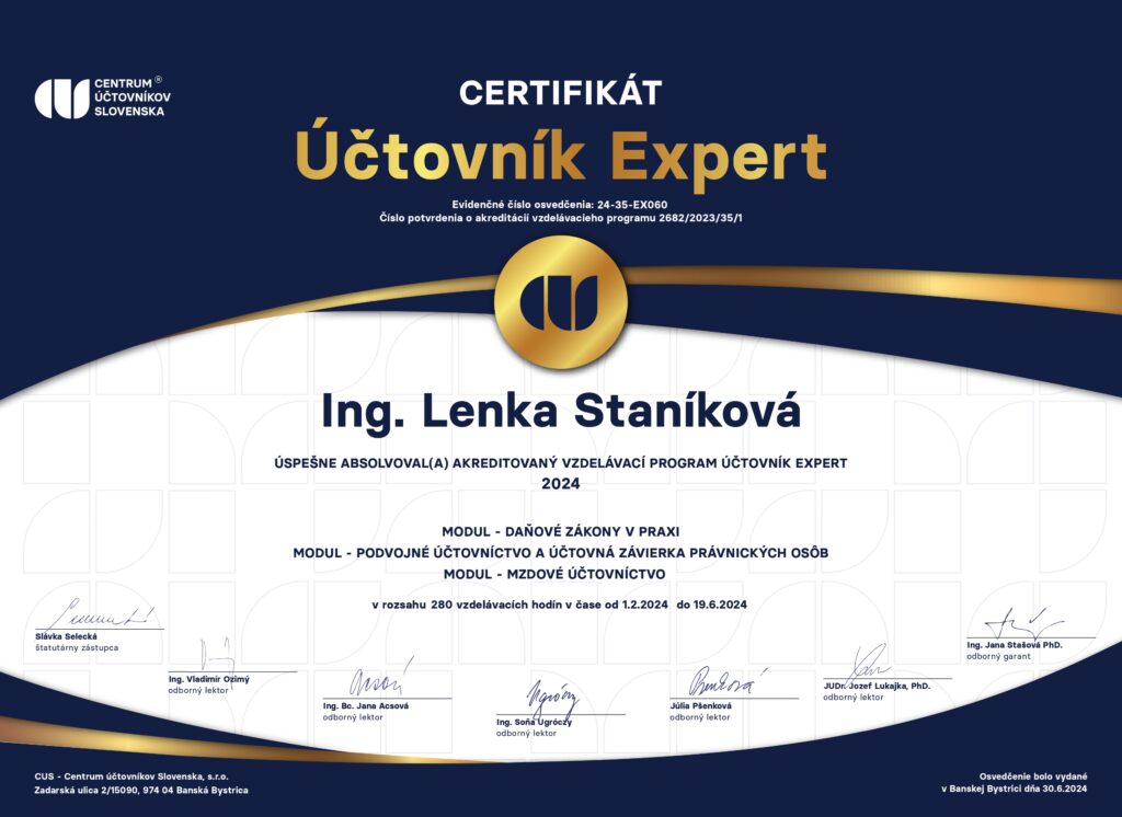 Naše služby sú podporené naším stálym vzdelávaním, preto ako absolventka Ekonomickej univerzity Bratislava v odbore Účtovníctvo a audítorstvo a aktívny člen CUS – centrum účtovníkov Slovenska, dbám na odborné a kvalitné poskytovanie služieb pre našich klientov.